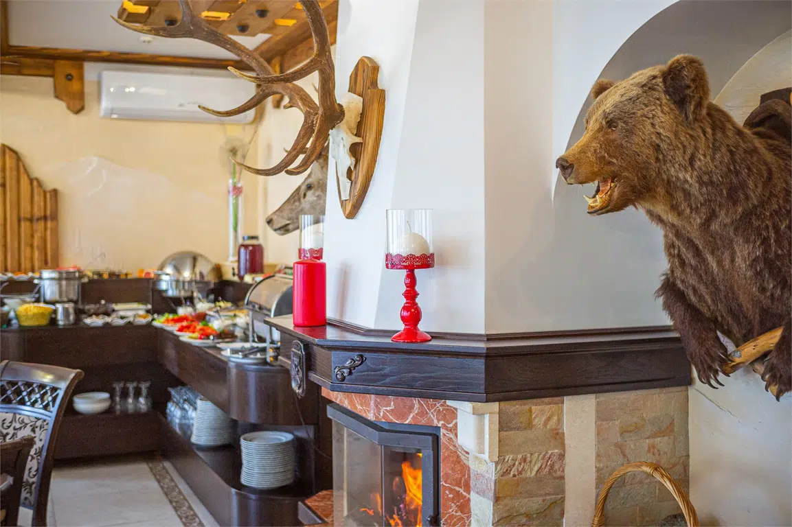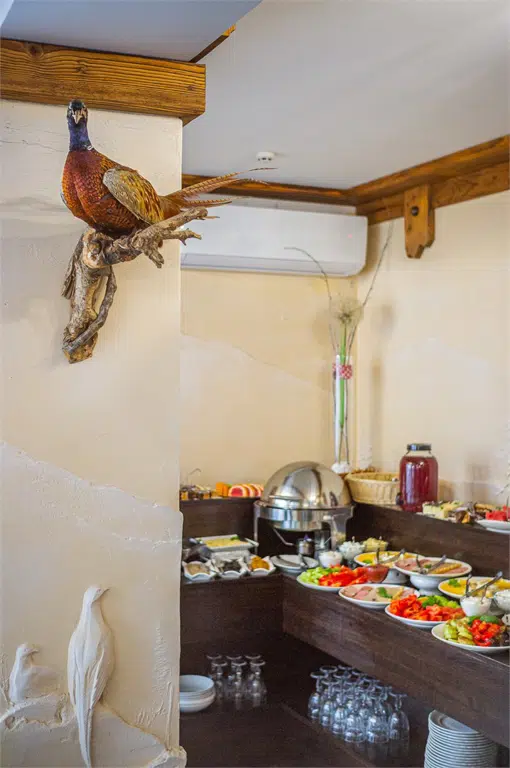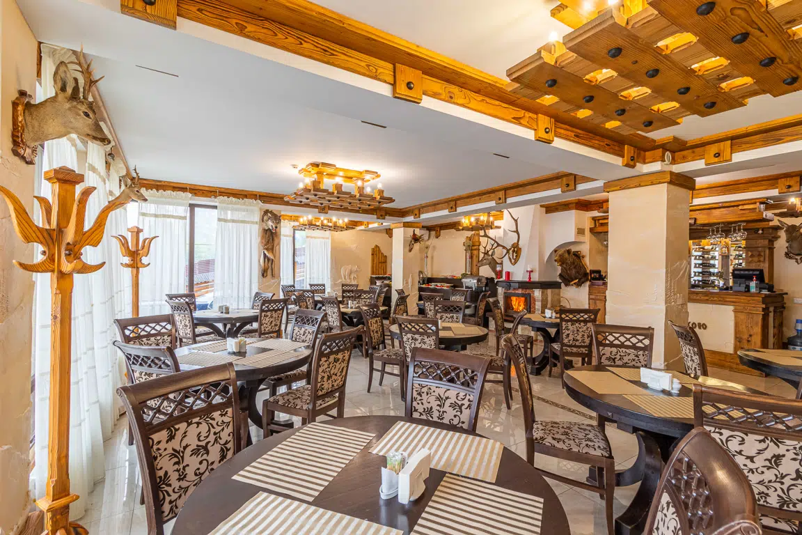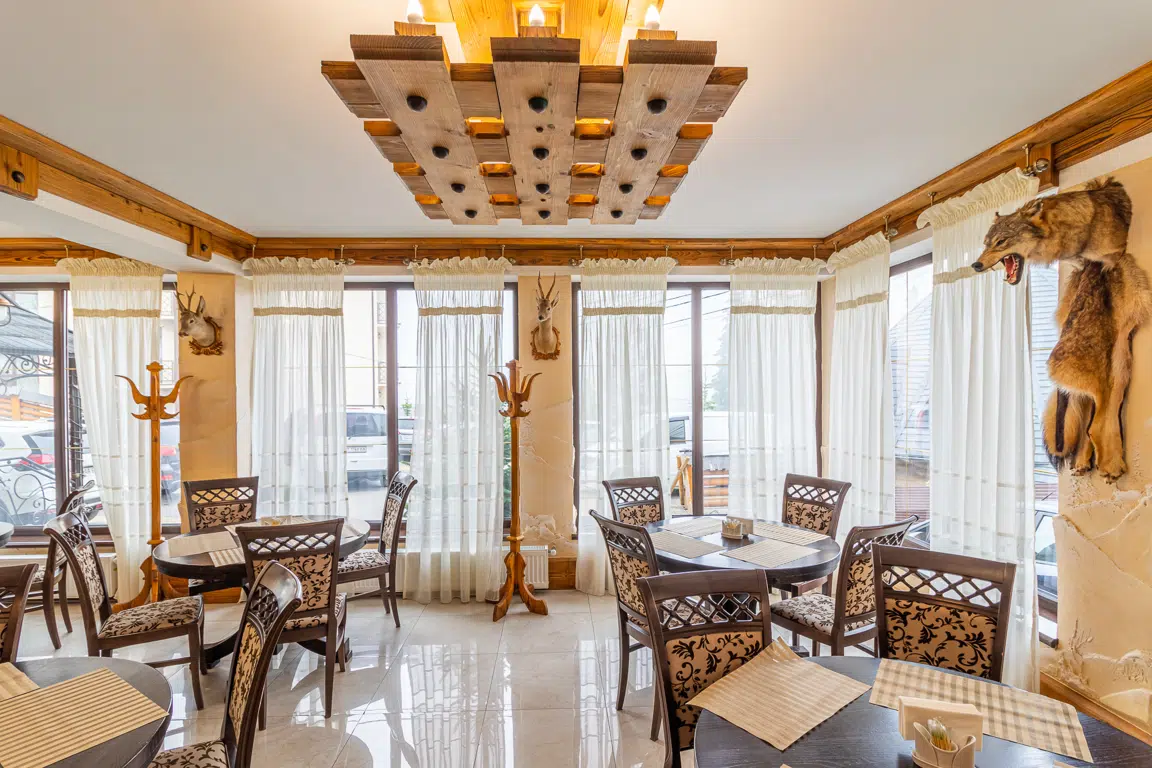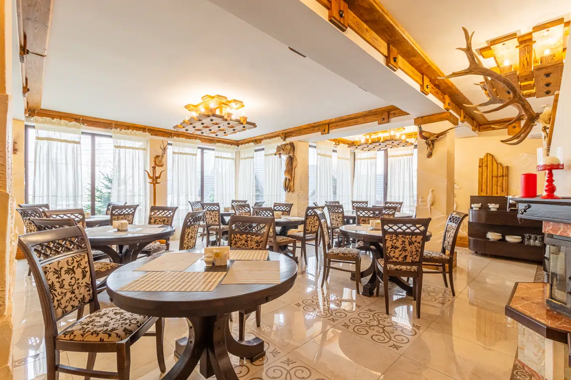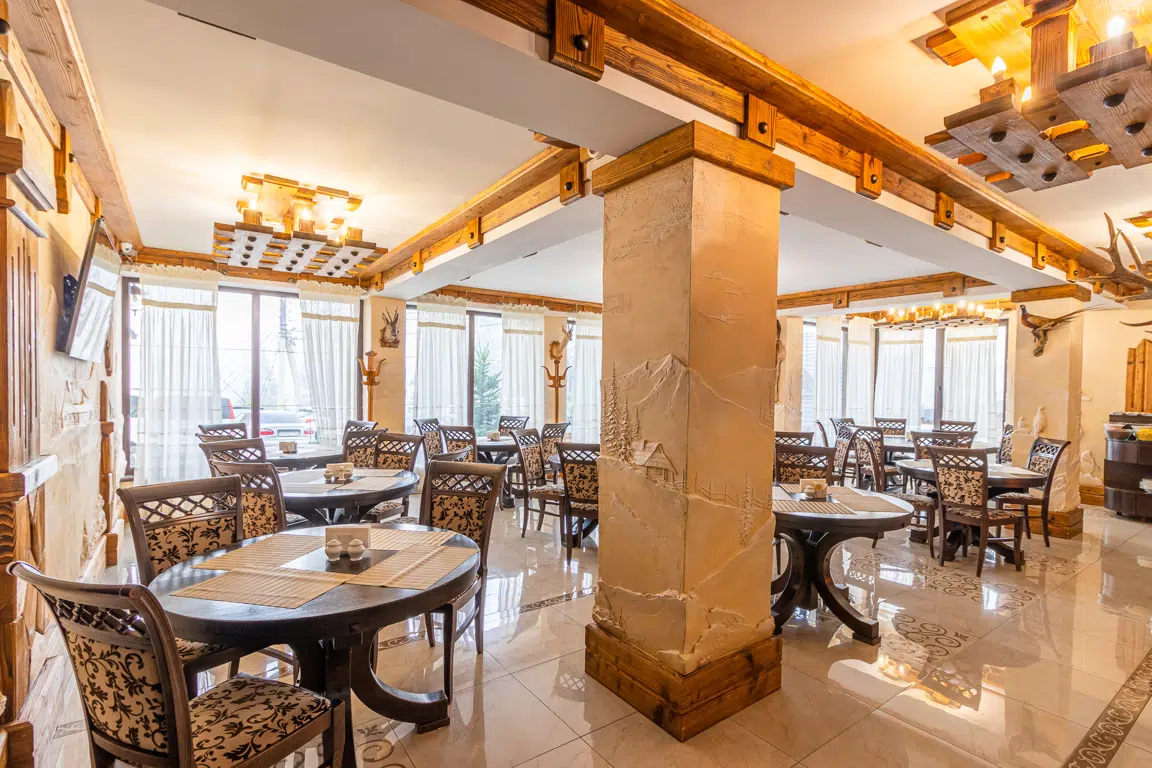 Власний просторий ресторан, декорований в українському стилі, у вишуканій атмосфері затишку пригощає постояльців смачними делікатесами з національної та європейської кухонь. Висококласні кухарі не втомлюються дивувати відвідувачів кулінарними шедеврами з натуральних продуктів місцевого виробництва.